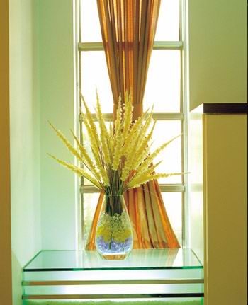 把原本細(xì)長(zhǎng)的窗戶加以延伸,運(yùn)用玻璃、鋼條兩種似近非近、張揚(yáng)個(gè)性的材質(zhì)層層疊加,組成晶瑩剔透的小裝飾臺(tái)。讓陽光透過玻璃的棱角放射出閃耀的光芒,照射在圓潤(rùn)的玻璃花瓶上,讓藍(lán)、黃、白色的水晶球一捧原野無味的干草花,一切就像一個(gè)默默無聞的傾聽者,把業(yè)主的情致、個(gè)性傳達(dá)得淋漓盡致。