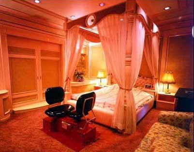 在洞房的四壁及天花板上,噴涂七彩墻飾涂料,以抽象、朦朧為基調(diào),造成一種如夢(mèng)似幻的神秘遐想效果,使新婚蜜月充滿浪漫氣息。