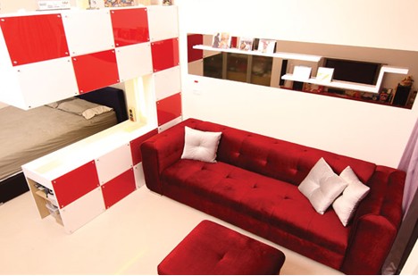 一走進(jìn)屋內(nèi),鮮明的幾何圖形立即吸引視覺目光,10坪大的空間里,透過鏡面的反射、大膽搶眼的紅白方形幾何,無形中展開空間的寬闊度。小坪數(shù)空間的配色是重點(diǎn)之一,若是顏色使用過多,不僅造成空間的紊亂感,更會(huì)模糊居家設(shè)計(jì)重點(diǎn)。