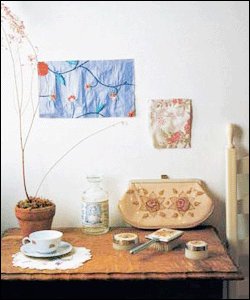 我們可以用精美的小塊刺繡制品裝飾臥室墻面。繡片整體顏色的選擇不宜與居室色調(diào)有太大的反差。把繡片剪裁成適當(dāng)大小,用雙面膠粘貼在墻上就可以了。梳妝臺上再放上刺繡手提包和有諧調(diào)的花朵圖案的梳子、化妝盒等物品,與墻上的繡片裝飾相得益彰。