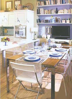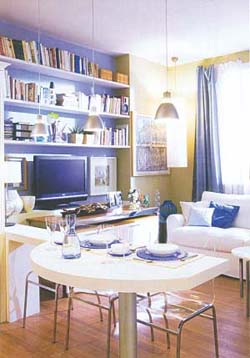 在這35平方米空間里可說是五臟俱全。一張餐桌、六把餐椅,占據(jù)了客廳的所有活動空間,但有了可伸縮的餐桌,在不聚餐的時(shí)候,客廳里的活動空間可被完整地還原。金屬結(jié)構(gòu)、橡木臺面的餐桌搭配半透明水晶外殼的椅子,布置出簡潔的就餐領(lǐng)地。準(zhǔn)備若干把可折疊的椅子是必要,方便就餐客人人數(shù)的增減。白色的桌布、藍(lán)白兩色的餐具干凈清爽??臻g雖小,與朋友相聚的快樂卻一點(diǎn)都不會減少。