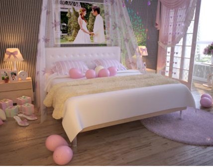 臥室內家具本來就不多,因此除了婚床之外,梳妝臺和床頭柜的布置也要細心留意,鮮花起到了活躍氣氛的作用,而相架則是兩人甜蜜的見證。