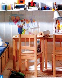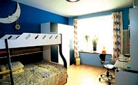為保證男孩的身體健康,兒童房中的家具都選用環(huán)保的實木家具,并鋪設實木地板。因為男孩年齡小,又好動,設計師選用了一張低矮的兒童床,以免孩子睡覺時“不老實”而翻下床。