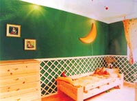 例如床上方的月亮,仿佛正在編制著一個多姿多彩的夢,并讓孩子的夢想插上翅膀,盡情飛翔。由于已經上學,這時孩子的房間多了一些電器,因此在書架上、窗臺上擺上一兩簇花草,調節(jié)屋內空氣。