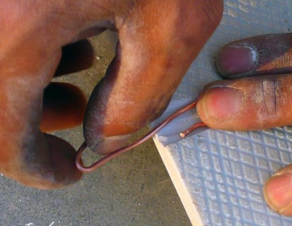 2.嵌入銅絲:這下你該明白為什么要開槽了吧,它就是容納這根銅絲的,用銅線彎成小S鉤放入槽內(nèi)。