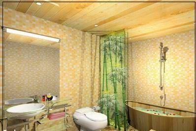 用玻璃隔斷、桑拿板吊頂、玻璃馬賽克,泡浴用的木桶就象放在沙灘上的一葉小舟,細(xì)長滴落的流水帶著花瓣順著光滑曲動的木桶流淌而下,緩緩從鋪著鵝卵石的地漏中流走,這樣的出浴圖,透出一抹香艷。裝修知識 裝潢www.ucrt3e.cn