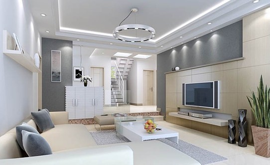 一個(gè)很大的客廳,凈高在3.5米左右。設(shè)計(jì)師為它設(shè)計(jì)了一個(gè)復(fù)雜的吊頂,吊頂中心呈圓形,周?chē)暮穸劝茨鏁r(shí)針?lè)较蛟黾?,使平面的天花板呈現(xiàn)出立體感。