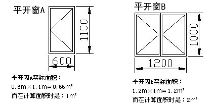 平開窗是按開出1扇窗1m2計算,平開窗A的面積為0.66 m2,不足1m2,按1m2計算。平開窗B實(shí)際上是算2扇平開窗,因此算2m2。