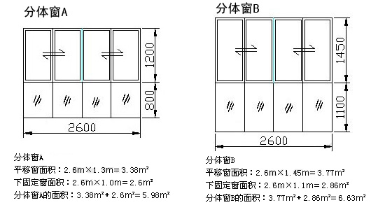 分體窗A的平移窗高度、下固定窗高度均不足限定的1.3m、1.0m的,所以要按最低標(biāo)準(zhǔn)1.3m、1.0m計算;而分體窗B的兩個高度均超出此標(biāo)準(zhǔn),就按實(shí)際高度計算。