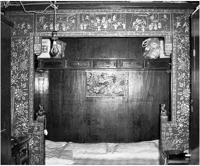 “徽州滿頂床”的床沿口一面,是一個紅彤彤、金閃閃、描龍繪鳳的“口”字形的床臉兒,最底下的床架主體是看不見的。上端橫有一塊鑲有花邊的長條板壁,兩側(cè)各有一頂天立地的長條板壁,它們與床沿下部的橫向板壁一起構(gòu)成中間空出的床門,床門內(nèi)側(cè)掛有中開式藍(lán)花土布門帳,開合自如。有些掛落,有些角飾,盡顯徽州木雕之技藝。床沿口一面的四周床臉板壁上,均漆上通紅的土漆,然后以金色線條勾畫上各種各樣的美麗、喜氣、祥和、民俗的圖案,諸如:龍鳳呈祥、花好月圓、麒麟送子、松鼠如意之類,有點(diǎn)喜氣洋洋、金碧輝煌的況味。床的內(nèi)壁表面則漆成暗紅色,在這樣的徽州滿頂床上下榻休憩,猶如躲進(jìn)小木屋、身處童話境一般,美妙極了,舒服極了。比較講究點(diǎn)的“徽州滿頂床”,還在床內(nèi)的正壁上橫設(shè)一長條紅彤彤的抽屜櫥柜,一長列排開四個抽屜,放置些私房錢財、金銀首飾、換洗衣褲之類;櫥柜上面正好成為一長條案,可以擱置些古玩擺設(shè)和常用生活物品。