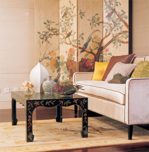 明亮清新的起居室,在多樣的風格素材下,創(chuàng)造出富麗堂皇的視覺美感,散發(fā)著無限的想象力與設計感。而素色沙發(fā),用簡單的咖啡色線條勾勒著絨布的面,與之對比的是茶幾漆面上深沉的花樣暗紋;背景,枝藤蜿蜒盤繞的華麗屏風,孔雀低身親近綻開的牡丹。玻璃花器的光影變換與素燒瓷瓶的隱約釉痕,則靜靜地吸引著人們的目光,是目不暇給視覺旅程中停頓的休止符?;蛴怖拭骺?,或細膩婉約的線條生成了有生命力和表現(xiàn)力的藝術形式,營造出歡愉的起居室。這個起居室,陳述著東方文人的懷舊和對新時代的向往。