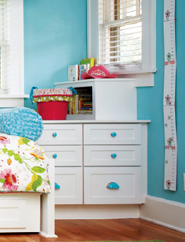 盡一切努力提高空間的使用率,給寶寶充足的地面玩樂空間,而不要讓大床占據房間的中心位置。為了達成這一目標,主人定做了一張稍大的單人床,貼墻放在窗戶的遮陽棚下方。具有多層收納格的儲藏柜則放在床的兩端,合適的高度還可使其充當床頭柜,床下面是大而深的抽屜,給衣服和玩具充足的收納空間。