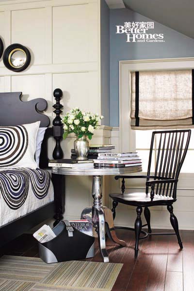 色彩:樸素的灰藍(lán)色和黑白色搭配,讓這個(gè)臥室顯得平和寧?kù)o,為居室增添清涼感的同時(shí)卻絲毫不顯單調(diào),藍(lán)色的背景性使用柔化了居室格調(diào),為炎熱的夏季降溫。