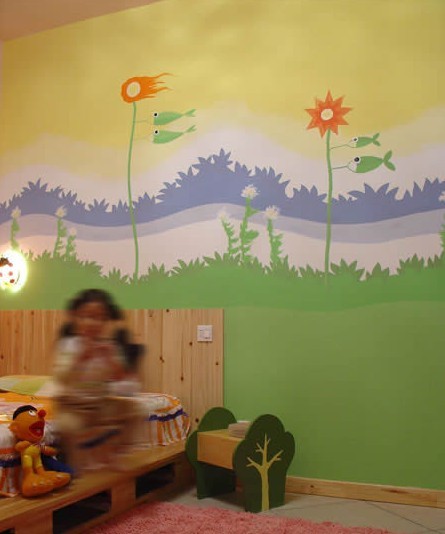 圖1:鄉(xiāng)村風(fēng)格的兒童房在床頭背景上采用了大面積綠色基調(diào)的手繪,清新自然;畫(huà)面選用童話主題,太陽(yáng)花和星星花長(zhǎng)著魚(yú)的葉子,隨風(fēng)飄飛,非常富有想象力。繪制材料:大面積暈染為乳膠漆加色精調(diào)制繪成,細(xì)節(jié)描繪為丙烯顏料。