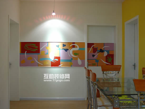 圖2:抽象風(fēng)格的繪畫(huà)在這個(gè)就餐兼過(guò)道空間中不僅弱化了過(guò)多的房門(mén),和現(xiàn)代簡(jiǎn)約風(fēng)格的配合也是天衣無(wú)縫,暖調(diào)、艷麗的色塊起到畫(huà)龍點(diǎn)睛的作用。