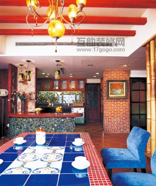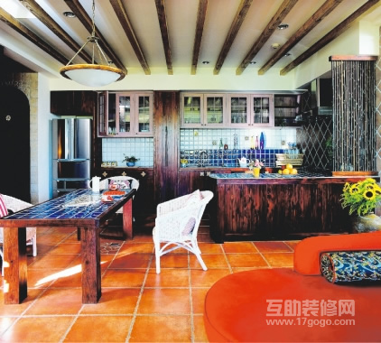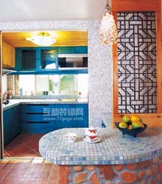將廚房外的墻面整理出一陽臺(tái),使廚房的空間不但光源充足,且視覺空間也可從廚房延展至餐廳及陽臺(tái),搭配慣用的磁磚拼貼流理臺(tái)及中島型吧臺(tái)桌、餐桌,并大膽用印度藍(lán)染色方式處理木柜門面,并用窗欞做廚房隔屏,使整個(gè)空間營造出帶點(diǎn)中國風(fēng)的地中海風(fēng)格。