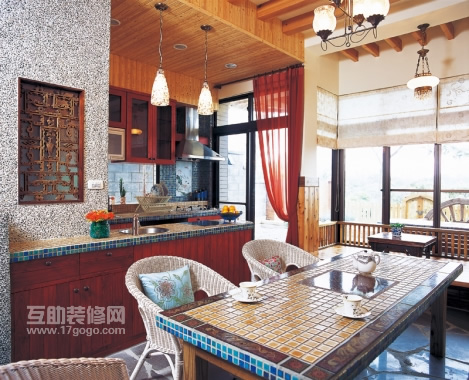 抱持「只要廚房空間美,任何人都會(huì)想在這空間大顯身手」的設(shè)計(jì)想法,設(shè)計(jì)師大膽地將國畫陶磚嵌在爐具臺(tái)面的壁面、將中國窗欞做成隔屏在吧臺(tái)上與廚房做視覺區(qū)隔、將各式各樣的磁磚拼貼在操作臺(tái)面上或餐桌臺(tái)面上、具有特色的燈具設(shè)計(jì)…等等。