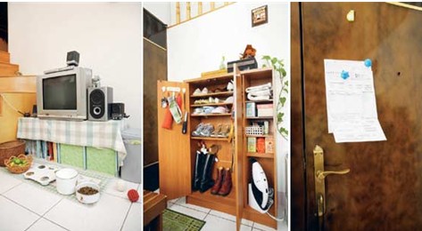 從玄關(guān)開始,一扇整理過的斑駁木門倚在墻邊,成為照片字條最佳的展示平臺,像是另類留言板,記錄著生活點滴。