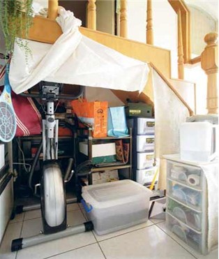 10.樓梯下的畸零空間擺上抽屜柜就能收納雜物,加個布簾遮起來就美觀多了。