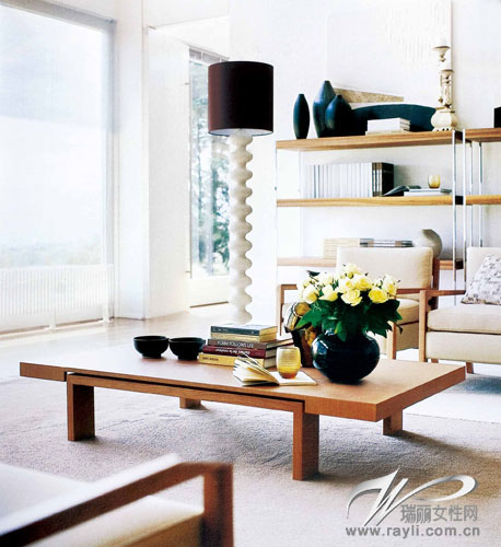 如果地面、墻面的主體色彩都以淺色為主,置入深色的家具就顯得有些突兀,淺卡其色系的實(shí)木家具能讓空間看起來(lái)既有重點(diǎn)又不顯得唐突;淺色實(shí)木家具能讓人覺(jué)得更加輕盈活潑,淺淺的底色讓木質(zhì)的天然花紋得到更充分體現(xiàn),由于淺色的木質(zhì)多為闊葉木,天然材質(zhì)未加工之前幅面較大且易于裁切,可以做出大體量的一體化家具,保證隔板、桌幾、沙發(fā)邊角在材質(zhì)上的整體感。