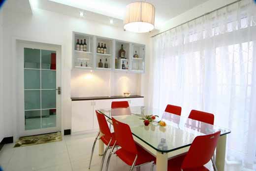 餐廳的設(shè)計(jì)風(fēng)格除考慮跟整個(gè)居室的風(fēng)格相一致外,氛圍上還應(yīng)把握親切、淡雅、溫暖、清新的原則,假如餐廳面積較小,可考慮在餐桌靠墻的一面裝上大的墻鏡,既增強(qiáng)了視覺通透感,又通過反光使居室顯得明亮,整個(gè)空間也就感覺開闊了許多。