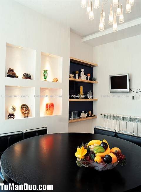 三、客廳或門廳兼餐廳用。在這種格局下,餐區(qū)的位置以鄰接廚房并靠近客廳最為適當(dāng),它可以縮短膳食供應(yīng)和就座進(jìn)餐的走動線路,同時也可避免菜湯、食物弄臟地板。餐廳與客廳之間可采用靈活處理,如用壁式家具作閉合式分隔,用屏風(fēng)、花格作半開放式的分隔,用矮樹或綠色植物作象征性的分隔。這種格局下的餐廳應(yīng)注意要與主要空間即客廳在格調(diào)上保持協(xié)調(diào)統(tǒng)一,并且不妨礙通行。