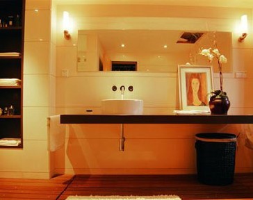 如果浴室里安裝的是掛墻式臺盆,那么臺盆上下方空間都有了可利用的余地,在下面安置可以收放物品的浴室柜是最常見的方法,上方則可以安置鏡柜。