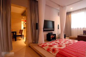 在擺放床的地域處,裝修出10公分左右高的木質(zhì)“地臺(tái)”,相應(yīng)地選用較低矮的床。其效果是:使睡眠區(qū)的環(huán)境更為清潔;地臺(tái)烘托中的床與人更有一種“精品”的藝術(shù)美感;尤其是花梨木質(zhì)的地臺(tái)還可給人以芬芳的氣息。