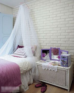 就一般床的構(gòu)造而言,床頭的高度欠缺氣勢(shì)。因此,對(duì)床頭的那面墻有必要進(jìn)行特別的裝飾,如用板材或裝飾布等,裝飾出幾平方米的面積;此外,用紡織面料制作的床頭的“床幔”,好似人的頭飾,大有可為,如用窗簾布垂掛、對(duì)開(kāi)等造型,猶如給床戴上了花頭巾。