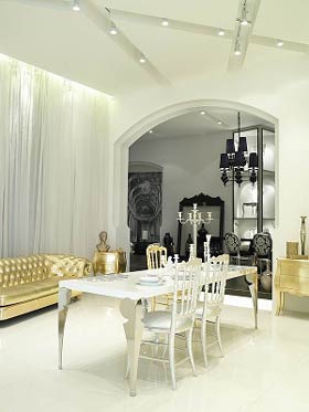 復(fù)古風(fēng)格家具在這些色調(diào)下看起來好似一幅幅現(xiàn)代摩登場景。眩目的金銀光澤帶來富有沖擊力的奢華視覺;黑與金的沖撞,帶著些許妖媚;而柔美、安嫻的白色,褪去了金銀光澤中的世俗煙火氣,略加少許淡藍(lán)色的點(diǎn)綴,幾乎呈現(xiàn)出某種天使般的圣潔氣息。