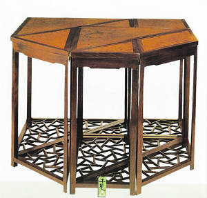 “最難制作的家具是什么?我認(rèn)為七巧桌,它是由七巧板演變而來的?!蓖醪媒榻B說,中國古代智力游戲中最有名的是七巧板,根據(jù)七巧板的原理,可以拼出很多種圖形,那么七巧桌也就同樣能拼出多少樣式。七巧桌有二個大三角形,二個小三角形,一個中三角形,一個正方形,一個平行四邊形組成,“可聚可散,可以用各種方式加以變化,七巧桌傳世實物不多見,蘇州留園有一張紅木、石頭面,我在南通買過一件殘件?!?/FONT>