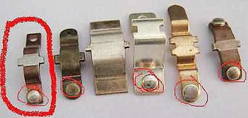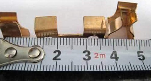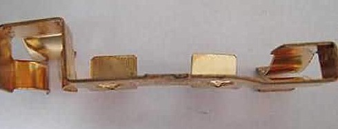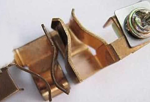 老式的鉚接銅片(明顯的可以看出兩頭材料跟中橋材料完全不一樣,而且有明顯的鉚接點)。一次成型永遠比老式的鉚接銅片好,因為一次成型的銅片永遠比鉚接的電阻小,相對發(fā)熱量也越小,彈性更好,安全系數(shù)越高,導電性越高)它的道理跟家里裝修房子線管里的電線是一樣的,一根完整的電線跟打結(jié)電線的區(qū)別。