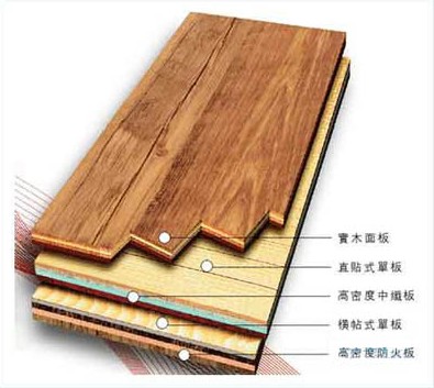 實木復合地板:多層結構,用多種天然木材切板,多層復合在一起,一般表層使用紋理漂亮的高檔木材,其它層使用一般的木材。