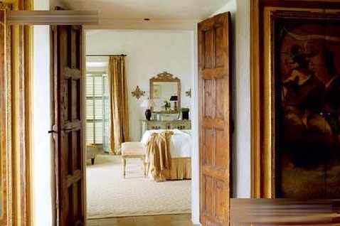 由德國(guó)室內(nèi)設(shè)計(jì)師NonavonHaeften設(shè)計(jì)的西班牙馬略卡(Mallorca)的一間大屋,整間屋的設(shè)計(jì)風(fēng)格和裝飾擁有濃厚的法國(guó)和西班牙風(fēng)味。圖中是主人房門(mén)前的一場(chǎng)景。主人房前擺放了不同的古董油畫(huà)和藝術(shù)品,看過(guò)展覽后一打開(kāi)門(mén)就是舒適的主人睡房,不要以為這一對(duì)厚木門(mén)不怎么樣,它本身也是一對(duì)古董西班牙木門(mén),是屋主的展品之一。厚厚的整塊木板和簡(jiǎn)單而堅(jiān)實(shí)的門(mén)柄配上幾何圖形的花紋,把藝術(shù)展覽和舒適睡眠之地分隔起來(lái)。