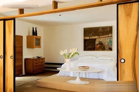 這是一間極具意大利風(fēng)情的小屋,其屋主和設(shè)計(jì)師是一來(lái)自英國(guó),名為MichaelPlayford的20世紀(jì)古董家具收藏家。因?yàn)樗惺詹胤侵藓腿毡竟哦呐d趣,其家居都滲入了絲絲的日式室內(nèi)設(shè)計(jì)風(fēng)格??蛷d安裝了日式的兩開(kāi)木趟門(mén),能分隔開(kāi)生活間和睡房的空間,趟門(mén)關(guān)上的時(shí)候讓室內(nèi)帶有一種日式的典雅、莊嚴(yán)和寧?kù)o;一打開(kāi)門(mén),就能展現(xiàn)出睡房那寬闊的空間,和屋主的珍藏品,既能用來(lái)招呼賓客,更是一個(gè)簡(jiǎn)單的古董家具展廳。
