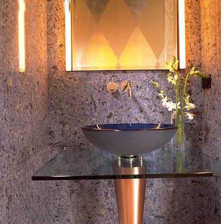 家庭衛(wèi)生間大多采用低彩度、高明度的色彩組合來襯托干凈爽快的氣氛,因此衛(wèi)生間的整體燈光不必過于充足,只要有幾處重點即可。