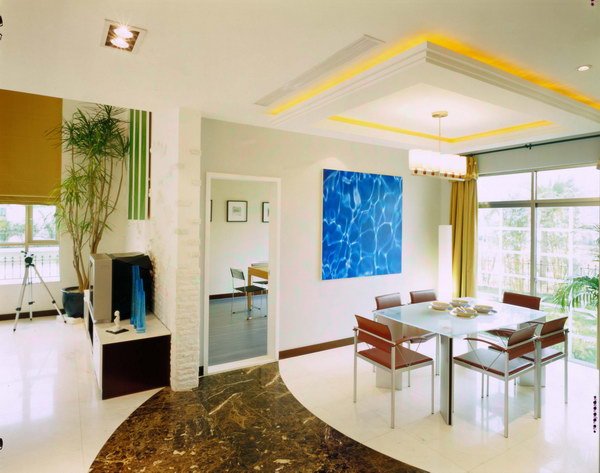利用裝修手法區(qū)分:各個(gè)功能性分區(qū)都有它的主要功能,您可以利用獨(dú)特的裝修手法來區(qū)分它們。這種區(qū)分主要在吊頂上,如在整個(gè)大廳中可以做兩個(gè)局部的吊頂,在會(huì)客區(qū)上方安置一個(gè)吊頂,在餐廳上方再安排一個(gè)吊頂,這樣就自然形成了兩個(gè)區(qū)域。另外,還可以利用墻壁裝飾來區(qū)分空間。如在會(huì)客區(qū)中,視聽設(shè)備后的“文化石背景墻”就與餐廳的“固定式餐具柜”形成鮮明對(duì)比。