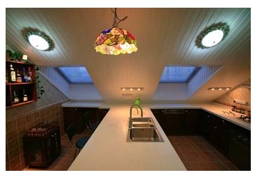 第六,如果廚房空間夠高(2.7m),可以在天花上安裝透明或半透明的吊燈作為光源,吊燈這時(shí)不僅可以提供絕佳的照明,還是很好的裝飾制品。
