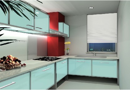 (2)L型:將清洗、配膳與烹調(diào)三大工作中心,依次配置于相互連接的L型墻壁空間。最好不要將L型的一面設(shè)計(jì)過長,以免降低工作效率,這種空間運(yùn)用比較普遍、經(jīng)濟(jì)。