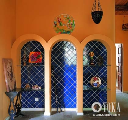 黃色和藍色的強烈對比,給人視覺以極大的沖擊。彩色玻璃既是墻面裝飾,又為墻后的衛(wèi)生間提供采光。上海裝潢網(wǎng)