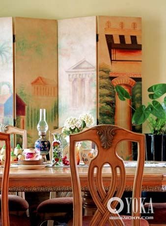 屏風(fēng)和餐桌雖然風(fēng)格不同,但卻用統(tǒng)一的色調(diào),把人包圍在愜意之中。桌上的餐具也讓人滿心歡喜。 上海裝潢網(wǎng)