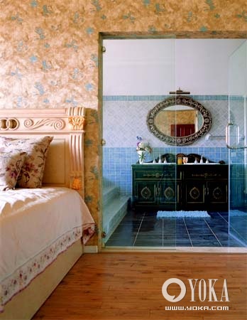 主人的臥室潔凈淡雅,沒有過多的裝飾,透過玻璃門與浴室相連,讓浴室的一角也成為臥室中的一個畫面。上海裝潢網(wǎng)