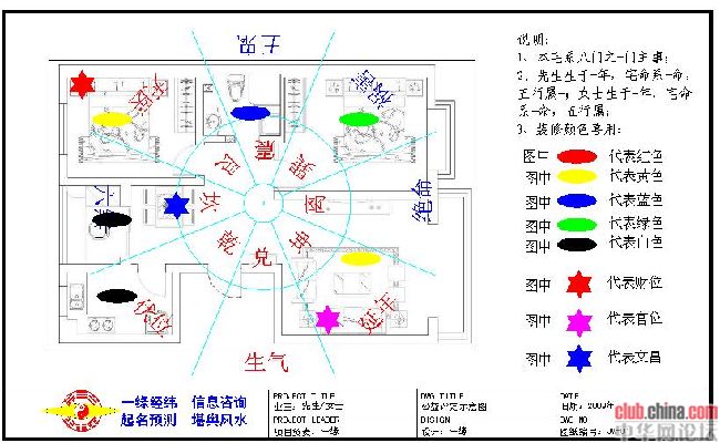 2、藍(lán)色橢圓表示此范圍裝修喜用藍(lán)色;