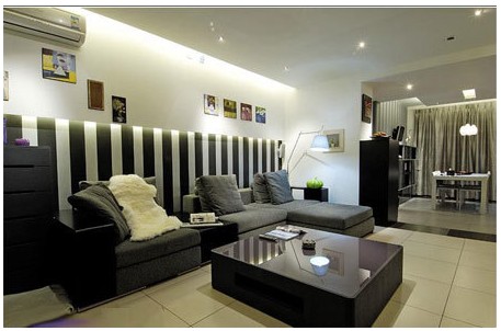 小戶型的空間狹小曲折,很多人為了裝飾效果,突出區(qū)域感,會在不同的區(qū)域用不同的材質(zhì)與高度來加以分別,天花也往往與之呼應(yīng),這就造成了更加曲折的空間結(jié)構(gòu)和衍生出許多的“走廊”,造成視覺的阻礙與空間的浪費(fèi)。地面的顏色應(yīng)統(tǒng)一成明度較強(qiáng)而純度較低的色系,地面的色彩應(yīng)略重于家具的色彩,這樣才不會產(chǎn)生頭重腳輕的感覺。也可以用一些馬賽克、鵝卵石等做一點(diǎn)帶有導(dǎo)向性的玻打線,打破沉悶的視覺效果。