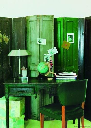 這件堪稱完美的屏風(fēng)其實(shí)是用舊櫥門改造而成,它還有一個(gè)實(shí)際的用途,那就是當(dāng)擺放在書桌邊的記事欄,有了它,我們就可以不用每天對著傻傻的電腦屏幕看東西了。其實(shí)你完全可以自制,是開玩笑嗎?當(dāng)然不是!那我們就動(dòng)手吧:先在板上涂一層磁化層,便于我們?nèi)蘸筚N上小便箋之類的東西,接著再在上面涂上具有英式風(fēng)格的褐色,那樣看起來會(huì)很時(shí)尚。為了使改造后的屏風(fēng)具有做舊效果,我們可以使用一些化學(xué)原料——堿式碳酸鉛溶劑來處理屏風(fēng)的表面紋理,也可以用砂紙手工打磨,這會(huì)讓它呈現(xiàn)出古舊的效果。