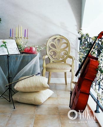 大提琴柔美的線條,與同樣西式彎曲線條感十足的家具擺放在一起,不僅彰顯了主人的愛好,同時也為居室劃分出了一塊輕松、舒暢的裝飾樂園。