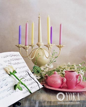 同為圓弧感且同樣低飽和度色彩的燭臺與茶具,擺放在一起,二者交相呼應(yīng) 。