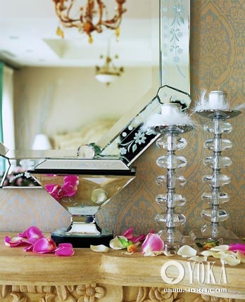 鑲花的鏡子與剔透的燭臺,使整個居室明亮又靈動;撒落于角落上的花瓣,將新婚的喜悅氣息娓娓道來。