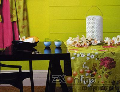 光是從玄關進入餐廳的角度來看,一個小小的用餐空間,就存在著火紅、天藍、粉橘……等三--四種顏色不等,而藍綠色的天花板,與墻面同一色調(diào)的畫作,是設計師有意讓視覺延伸與對應,使色彩表現(xiàn)出一種立體的趣味。