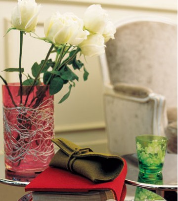 玫紅色的玻璃花瓶上金屬絲錯落盤繞,將白玫瑰映襯得格外浪漫,綠色印花水杯更顯得清新可人,紅與綠搭配出動人的和諧。